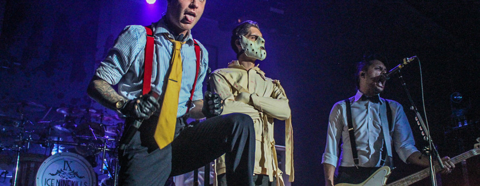 During intermission, we went to the merch tables where we were overwhelmed and decided to come back later. Just as we re-entered the arena a giant red curtain emerged which featured the title of a movie opening with the rating of the movie being IX the Roman numeral for 9. Seeing Ice Nine Kills live is definitely an experience to say the least. Each song is about a different horror film and the band re-enacts scenes from the movie as the song is being played live. The opening title credits to the movie began to play as the lights dimmed and the curtain dropped. The opening track Hip To Be Scared, based offf the American Psycho film kicked off which saw the band dressed as lawyers and businessmen on stage. Lead singer Spencer Charnas wielded a microphone in one hand and an axe in the other. Midway through the track an actor playing the "Paul" character in the American Psycho film waltzs on stage only to be "murdered" a few minutes later.